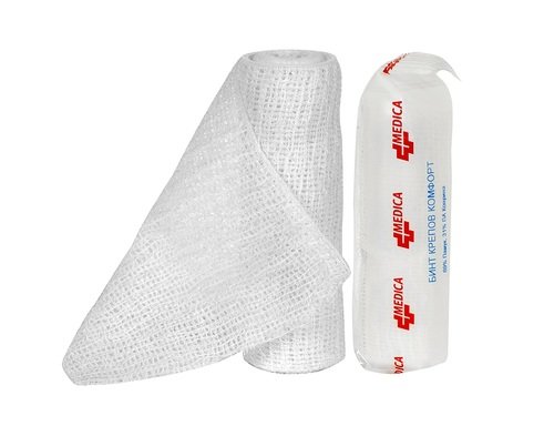Креповият бинт на Медика притежава 170 % разтегливост. Изработен е от мека, ефирна и деликатна материя. Предлага се в бял цвят със завършени краища. Притежава добра въздухопропускливост. Опакован е в прозрачно фолио. Лесен е за отваряне и употреба. Креповият бинт е подходящ за продължителна употреба при необходимост от стабилно прикрепване, особено за превръзка на гъвкавите зони на тялото. Подходящ е и за чувствителна и нежна кожа. Съставен е от 31% ПА коприна и 69% памук. Предлага се в опаковка от 4 м.